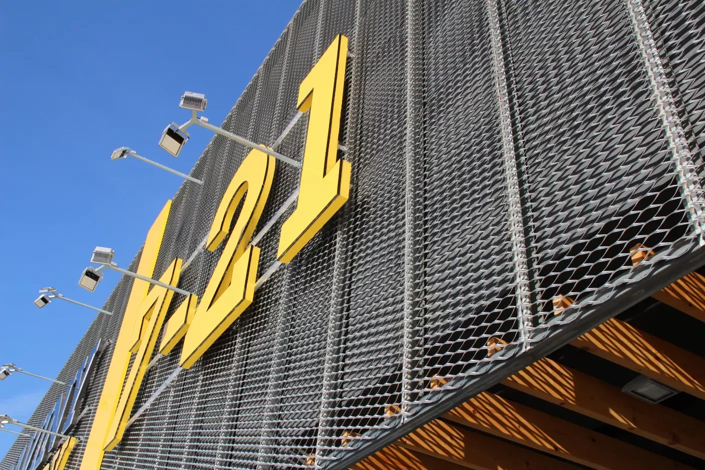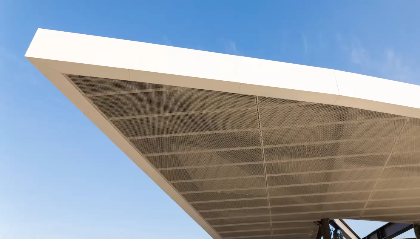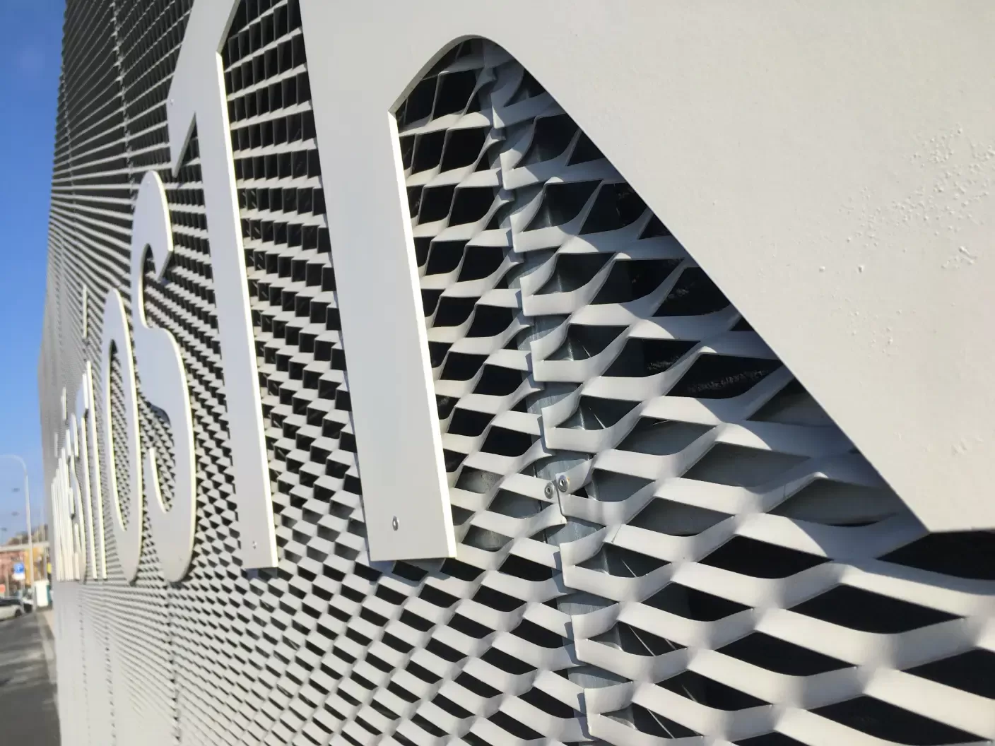 Company logo in expanded metal as a façade design element