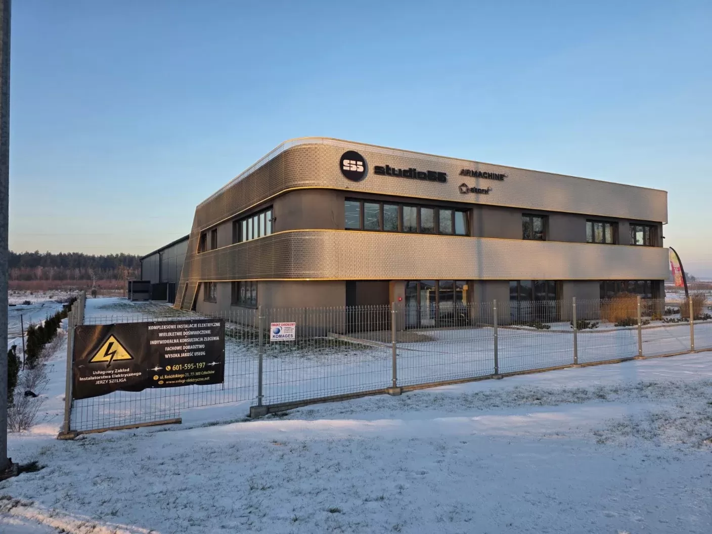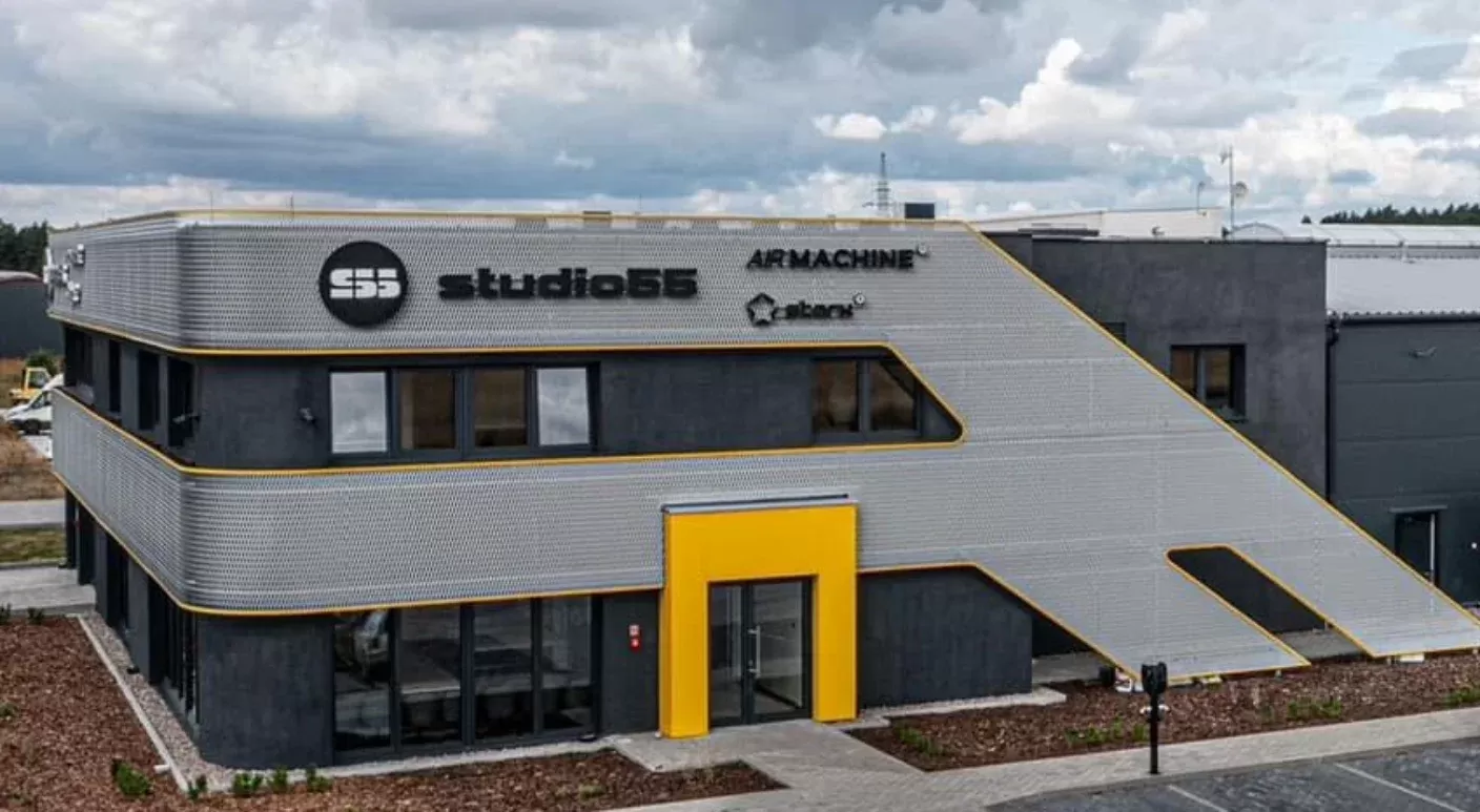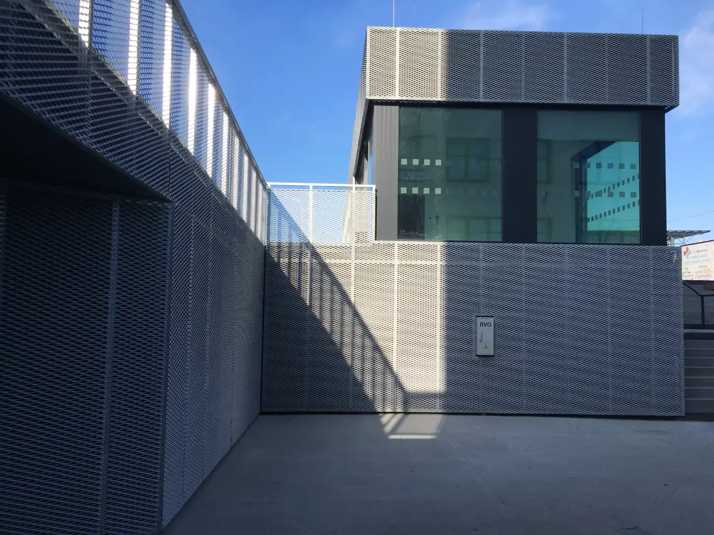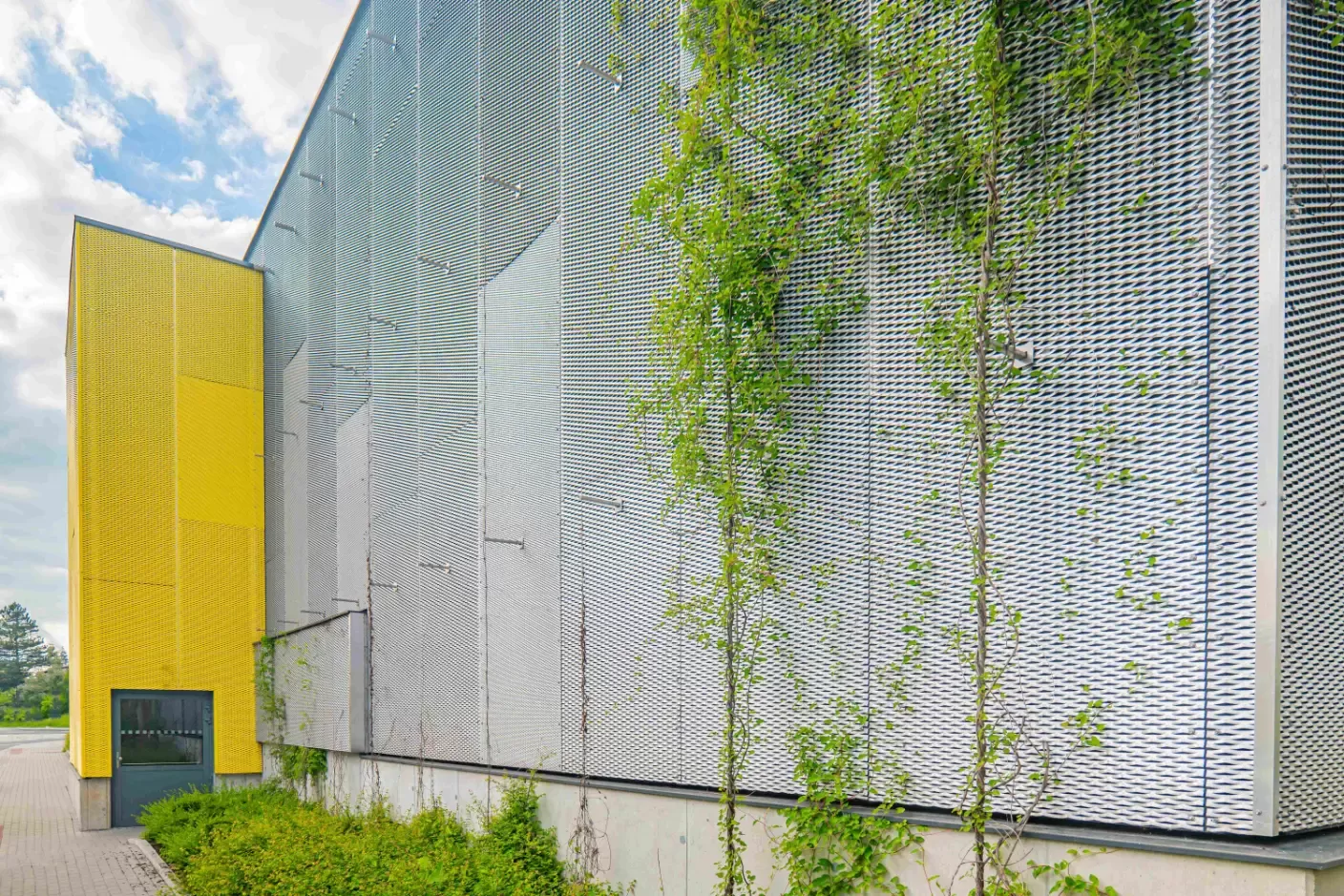 Company logo in expanded metal as a façade design element